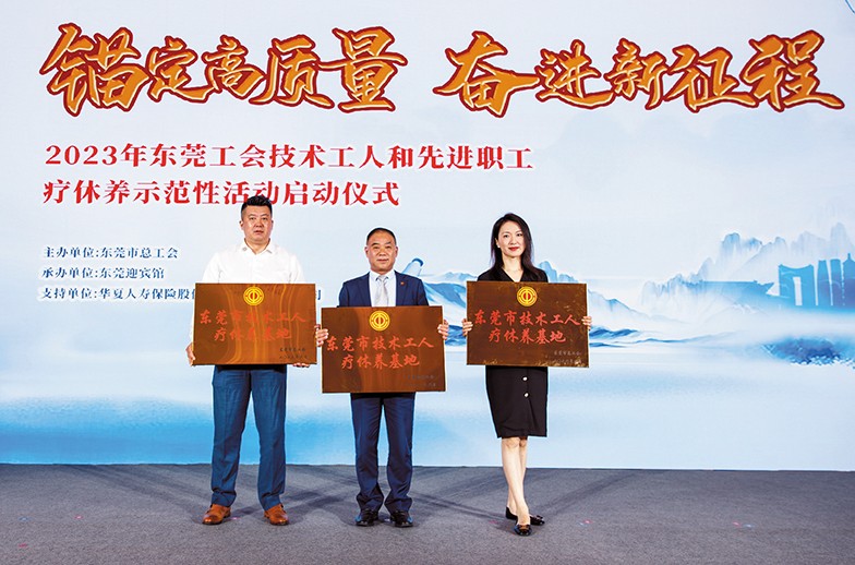 9.6月14日上午,東莞市總工會(huì)在東莞迎賓館舉行了2023年?yáng)|莞工會(huì)技術(shù)工人和先進(jìn)職工療休養(yǎng)活動(dòng)啟動(dòng)儀式。活動(dòng)中,市人大常委會(huì)副主任、市總工會(huì)主席羅軍文為入選“東莞市技術(shù)工人療休養(yǎng)基地”的12家單位頒發(fā)了牌匾。我集團(tuán)旗下三家酒店均榮譽(yù)入選“東莞市技術(shù)工人療休養(yǎng)基地”,橋頭三正半山酒店總經(jīng)理李啟清、樟木頭三正半山酒店總經(jīng)理施文靜、塘廈三正半山溫泉酒店副總經(jīng)理潘林等出席,并分別代表各自酒店上臺(tái)接受了牌匾。