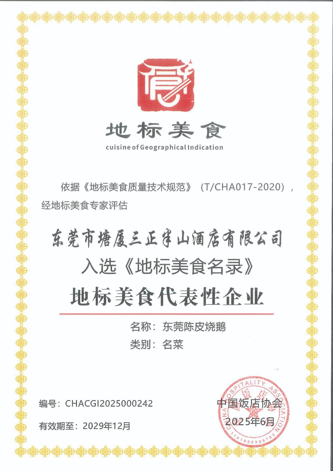 7.6月份,在中國(guó)飯店協(xié)會(huì)主辦的中國(guó)地標(biāo)美食評(píng)審中,塘廈三正半山溫泉酒店憑借漢宮中餐廳招牌菜“東莞陳皮燒鵝”成功入選《地標(biāo)美食名錄》,榮獲“地標(biāo)美食名菜”稱號(hào),酒店餐飲部副總監(jiān)兼出品部總監(jiān)藍(lán)武強(qiáng)被認(rèn)定為該菜品傳承人。同時(shí),酒店被授予“地標(biāo)美食代表性企業(yè)”榮譽(yù)。