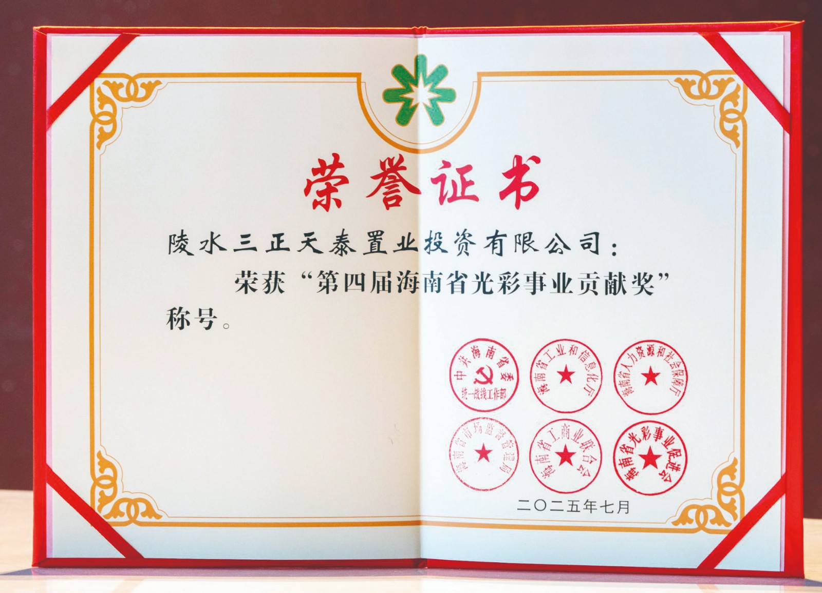 6.7月17日,第四屆海南省非公有制經(jīng)濟(jì)人士?jī)?yōu)秀中國(guó)特色社會(huì)主義事業(yè)建設(shè)者暨光彩事業(yè)貢獻(xiàn)獎(jiǎng)表彰大會(huì)隆重舉行。陵水三正天泰置業(yè)投資有限公司憑借在光彩事業(yè)領(lǐng)域的突出貢獻(xiàn)與持續(xù)踐行社會(huì)責(zé)任的顯著成果,榮獲“第四屆海南省光彩事業(yè)貢獻(xiàn)獎(jiǎng)”。